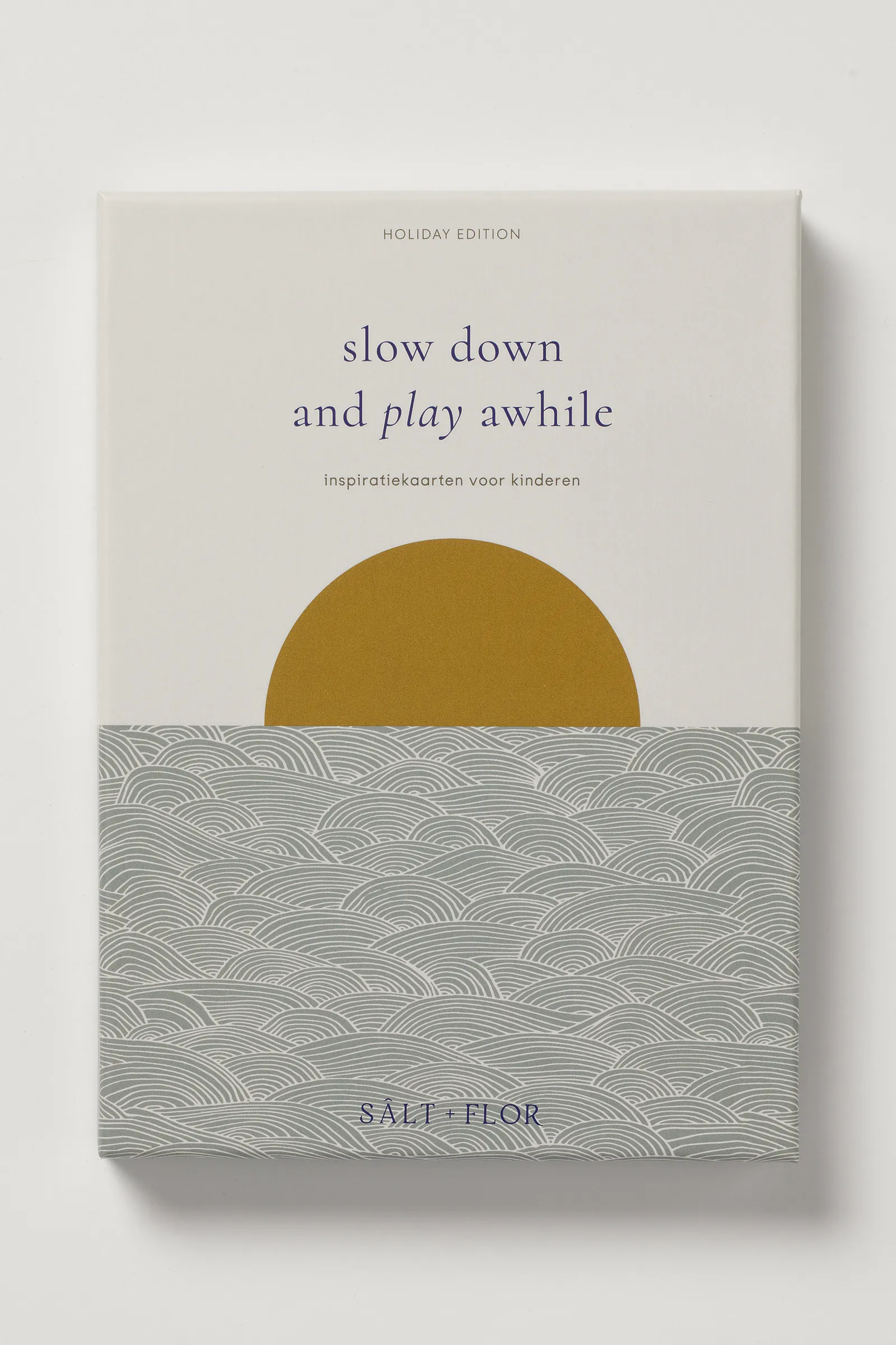 Slow down and play awhile – holiday edition is het een kaartendeck dat bestaat uit 37 met de hand geïllustreerde inspiratiekaarten + begeleidende reisgids. Geïnspireerd op de onbevangenheid, vrijheid en het pure van de Waddeneilanden. Met dit kaartendeck reiken wij ideeën aan die de verbeeldingskracht van kinderen aanwakkeren en ze uitnodigen naar buiten te gaan om eindeloos te spelen. Inspirerend spelen en blijvende herinneringen! Voeg een vleugje magie aan de dag toe door een kaart te trekken en op ontdekkingsreis te gaan.